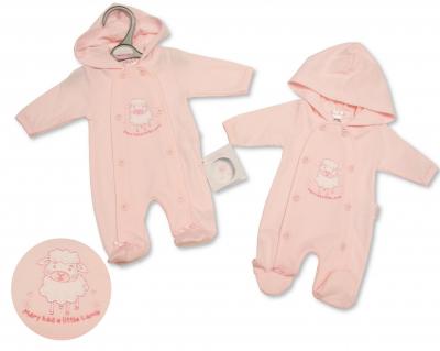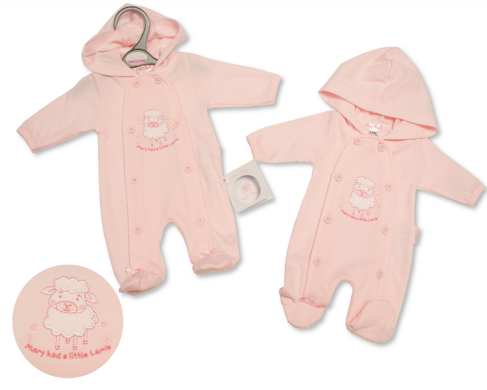Hooded, picot all in one with double button fastening to the front and legs. Appliqued/embroidered "Little Lamb" design. Ribbon bows.