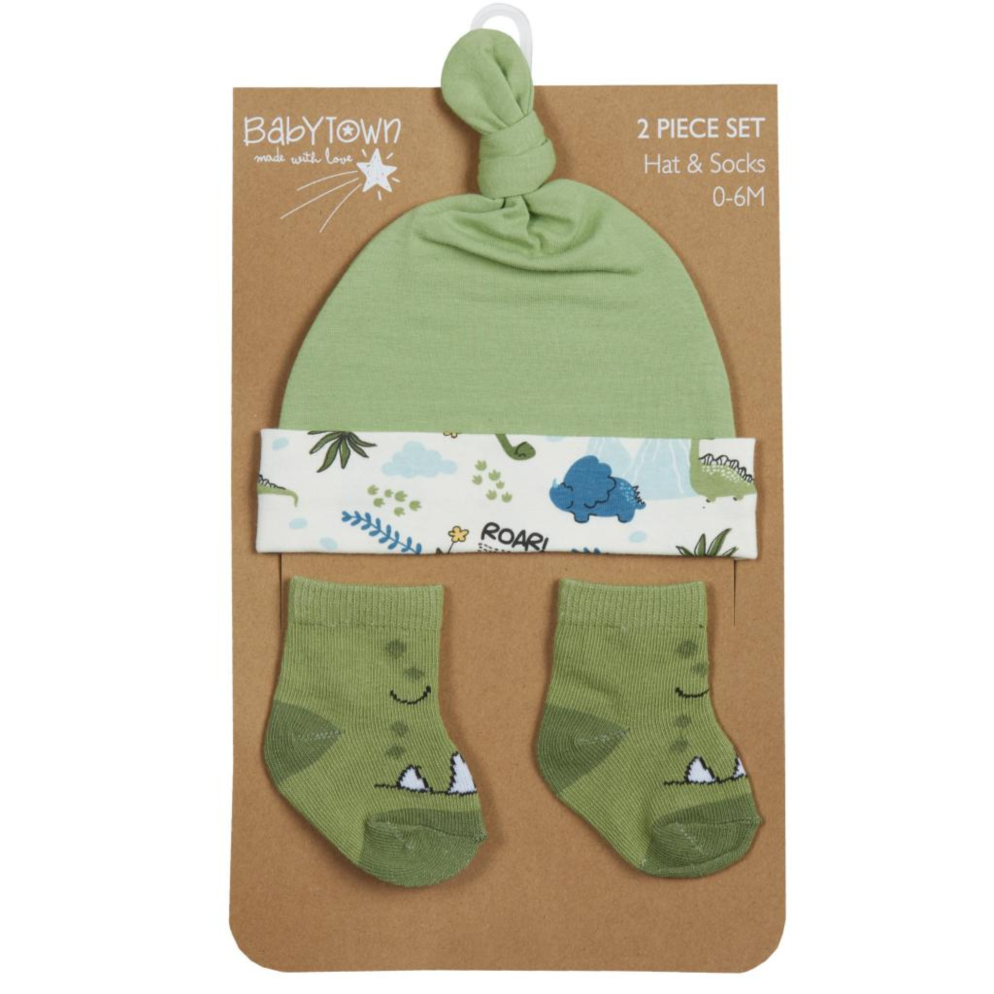 Knotted hat and sock set on header card. "Dinosaur" design.