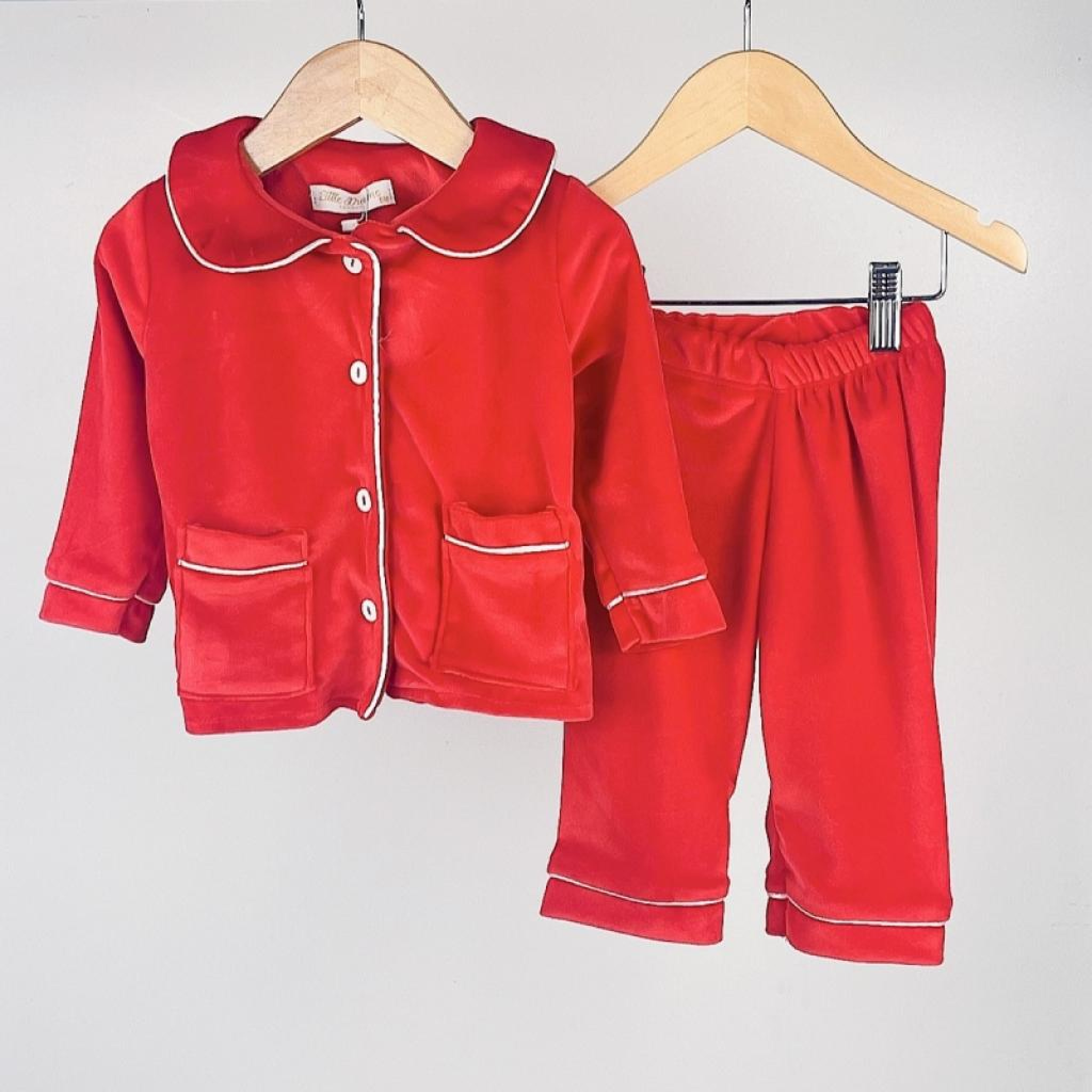 Ruby red satin velour Christmas ruffle co-ord pyjamas set with white piped sleeves, pockets and pyjamas, pointed peterpan collar and buttons.