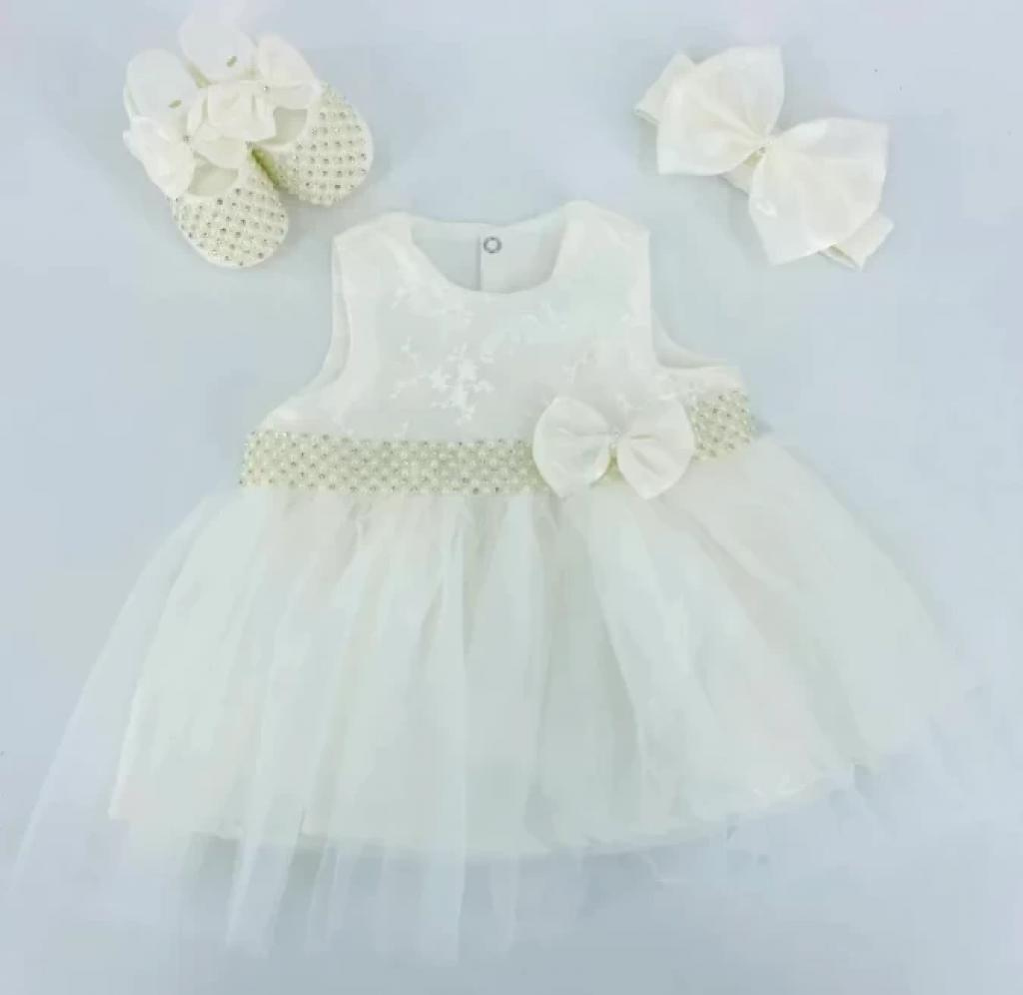 Satin and net dress with sequin bow with pearl and diamonte waist band. Bow to the front, matching detachable bow at the back.