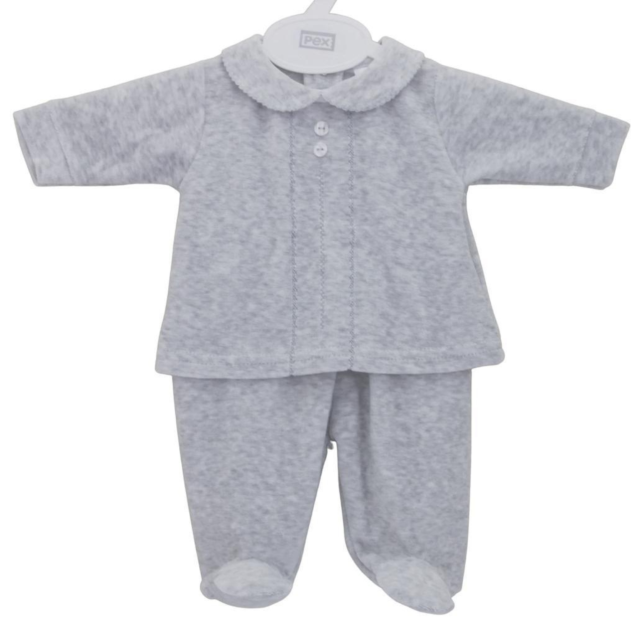 Made in the softest velour, this is a gorgeous way to lounge in style. The top has an elegant peter pan style collar and there are embroidered stitch details to the front with ornamental buttons at the neck. The matching trousers are comfortably elasticated at the waist and have cosily enclosed feet.