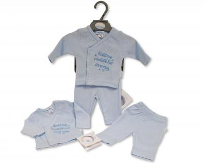 Wrap over top with popper fastening. Embroidered "Hold Me, Love Me Cuddle Me" design.
