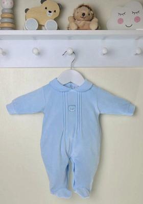 Velour all in one with popper fastening to the back and legs. Peter pan collar. Embroidered "Bear" detail and pleats.