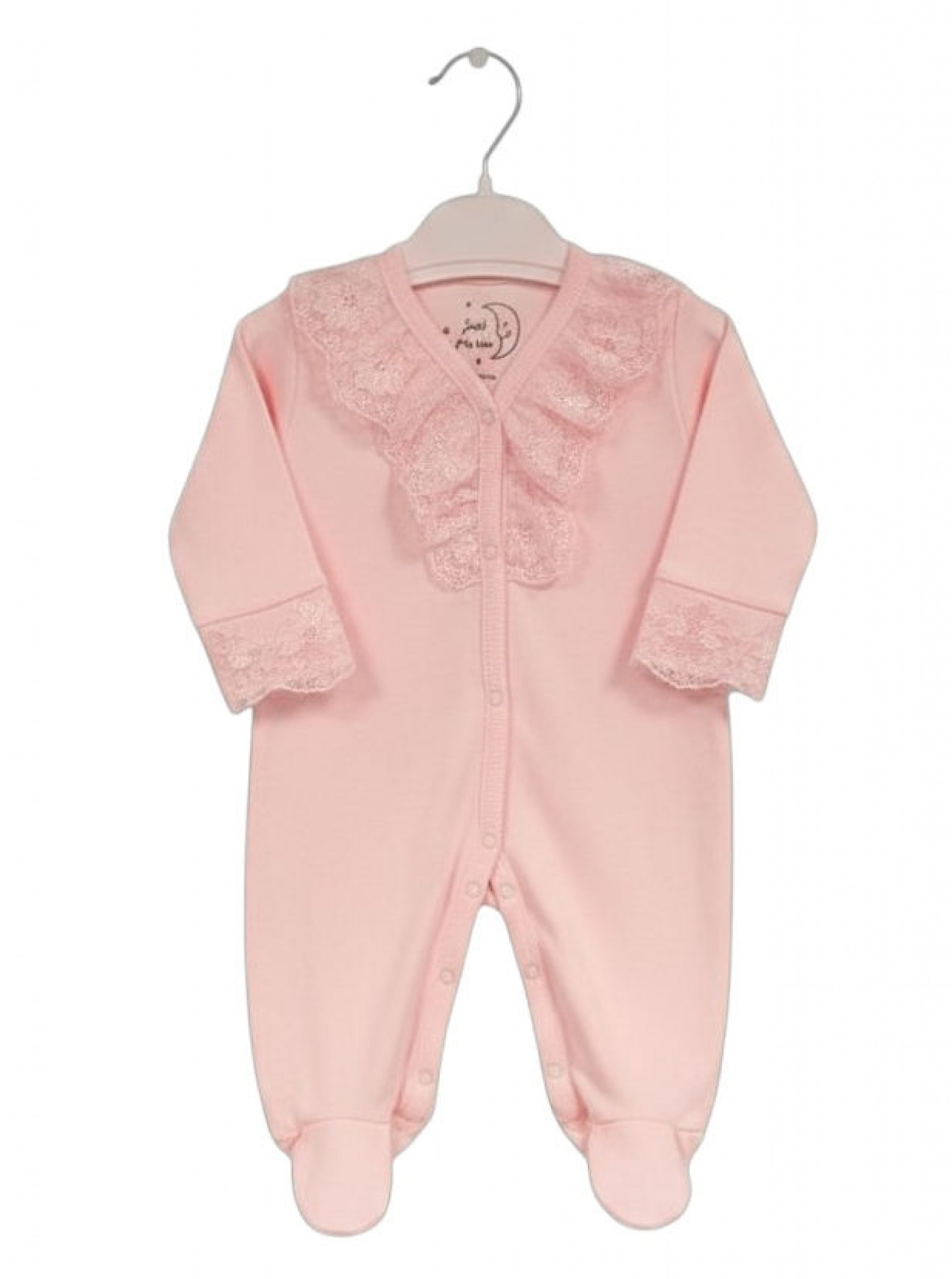 All in one with button fastening to front and legs. Lace trim to plackett and cuffs.