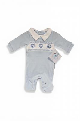 Collared all in one with fastening to the back and legs. Smocked panel with embroidered "Lion" design.