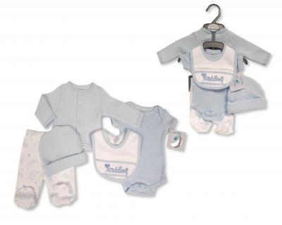 5 piece set. Smocked panel. Printed/embroidered "Cuddles" design: