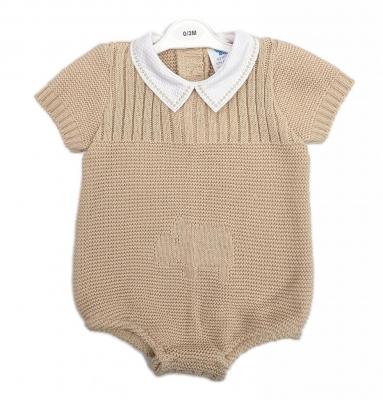 Knit Romper with button fastening to the back. Woven collar. Hippo detailing.
