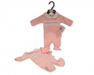 Quilted all in one with fastening to the back and legs. Peter pan collar. Smocked panel with embroidered "Princess" design. Ribbon Bows