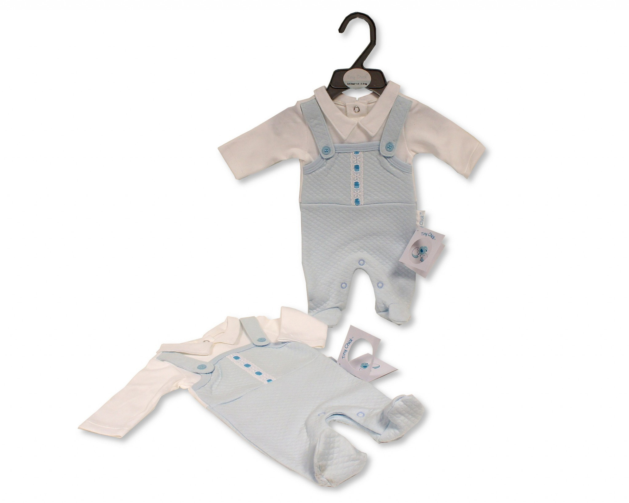 Quilted faux dungarees with feet. Lace with threaded ribbon.