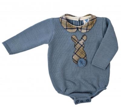 Long sleeve knit romper with tartan peter pan tartan collar. Tartan trim and matching bunny rabbit applique with pom pom.