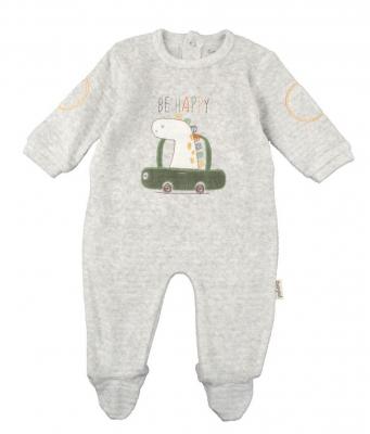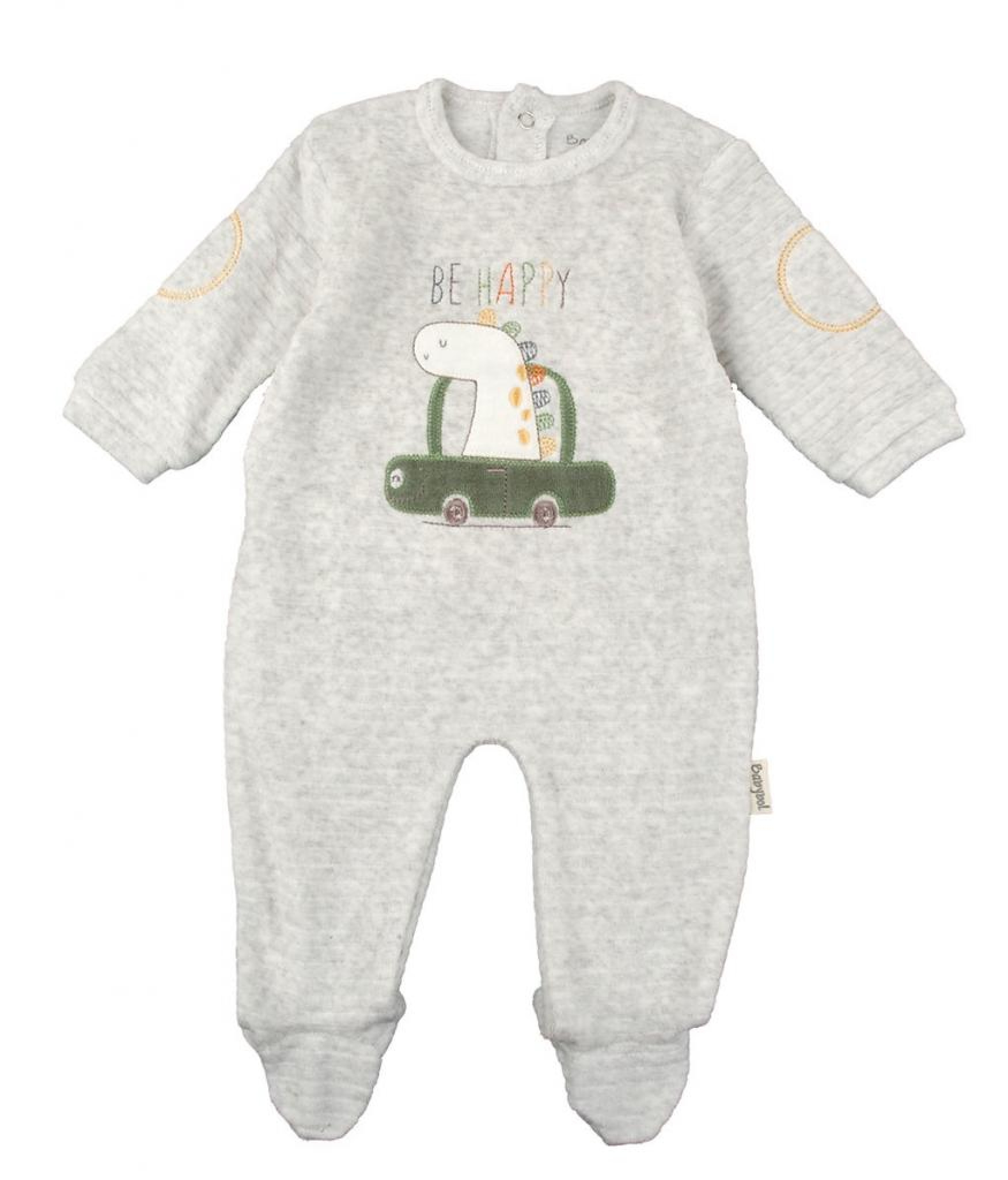 Ribbed velour sleeper all in one with poppers to the front and legs. Patches to the elbows. "Be Happy" dinosaur embroidery and applique Display Box Grey