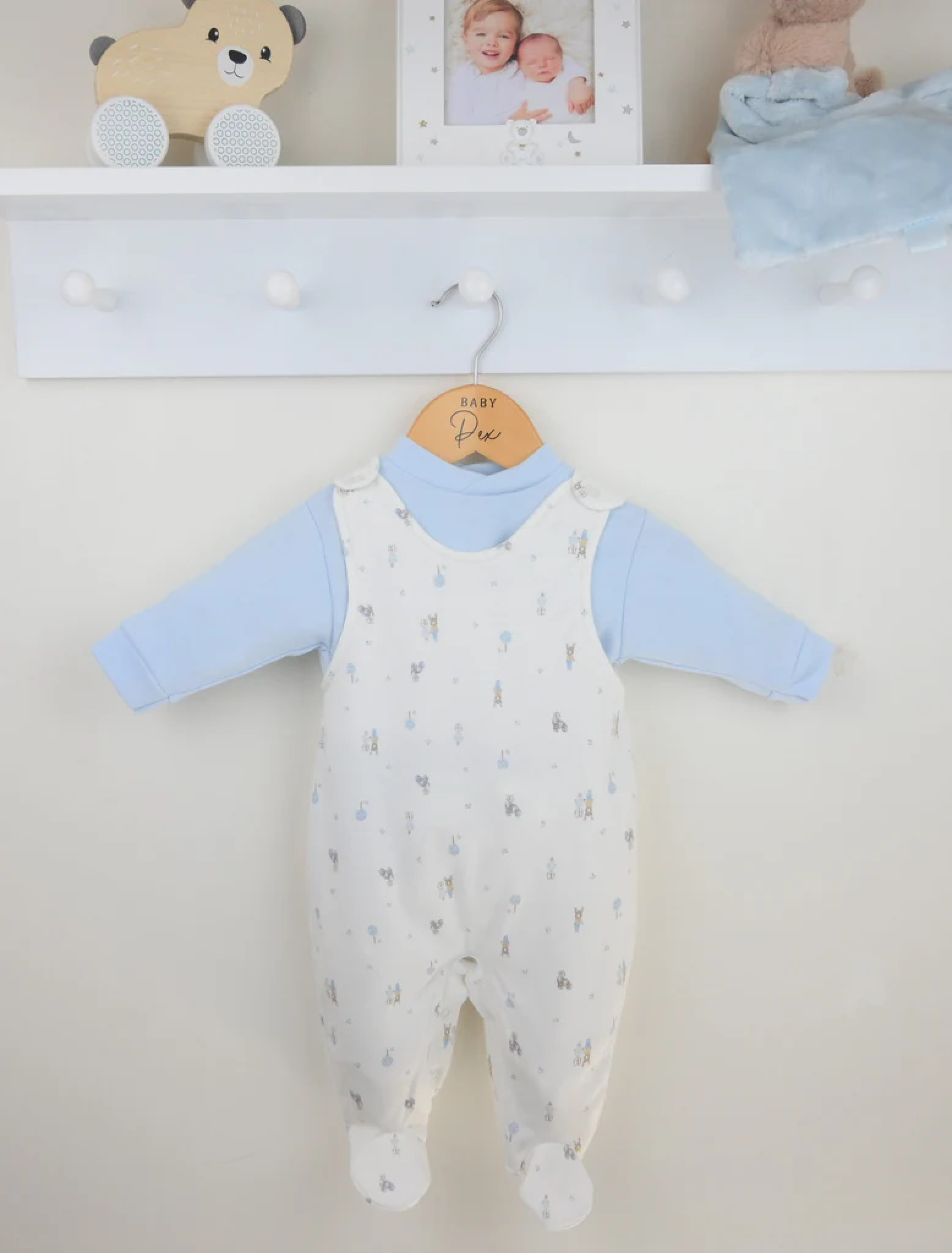 Luxuriously soft cotton dungaree suit featuring an incredibly cute woodland print. The ivory print dungarees have poppers between the legs and at the shoulders and fully enclosed feet. The long sleeved top is in a toning pale blue and has poppers at the back.