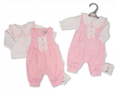Dogtooth romper with fastening to the back and legs. Contrasting panel with utton and bow detail.