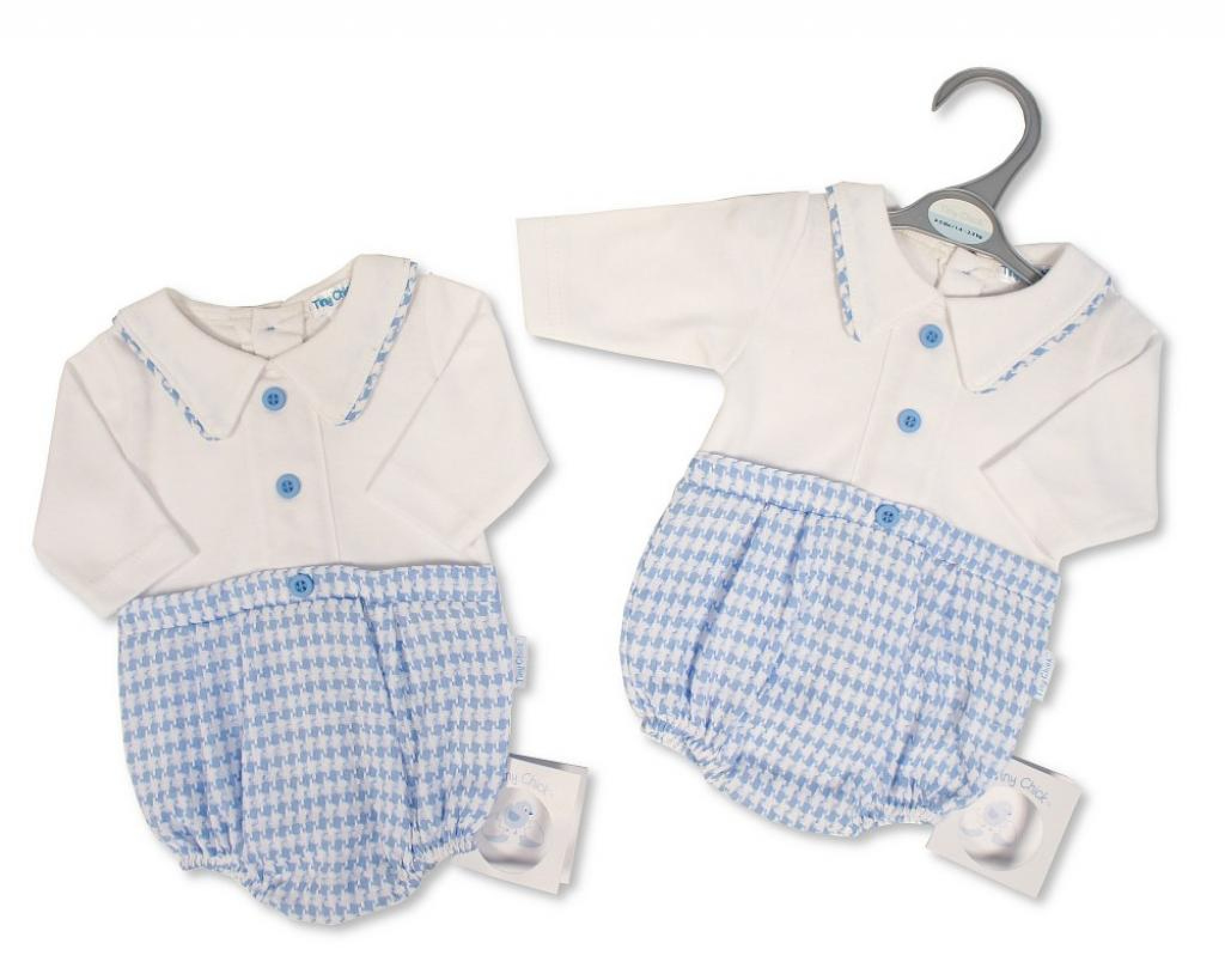Collared short romper with fastening to the back and legs. Dogtooth lower. Contrasting upper with faux placket and button detail. Dogtooth trim to collar.