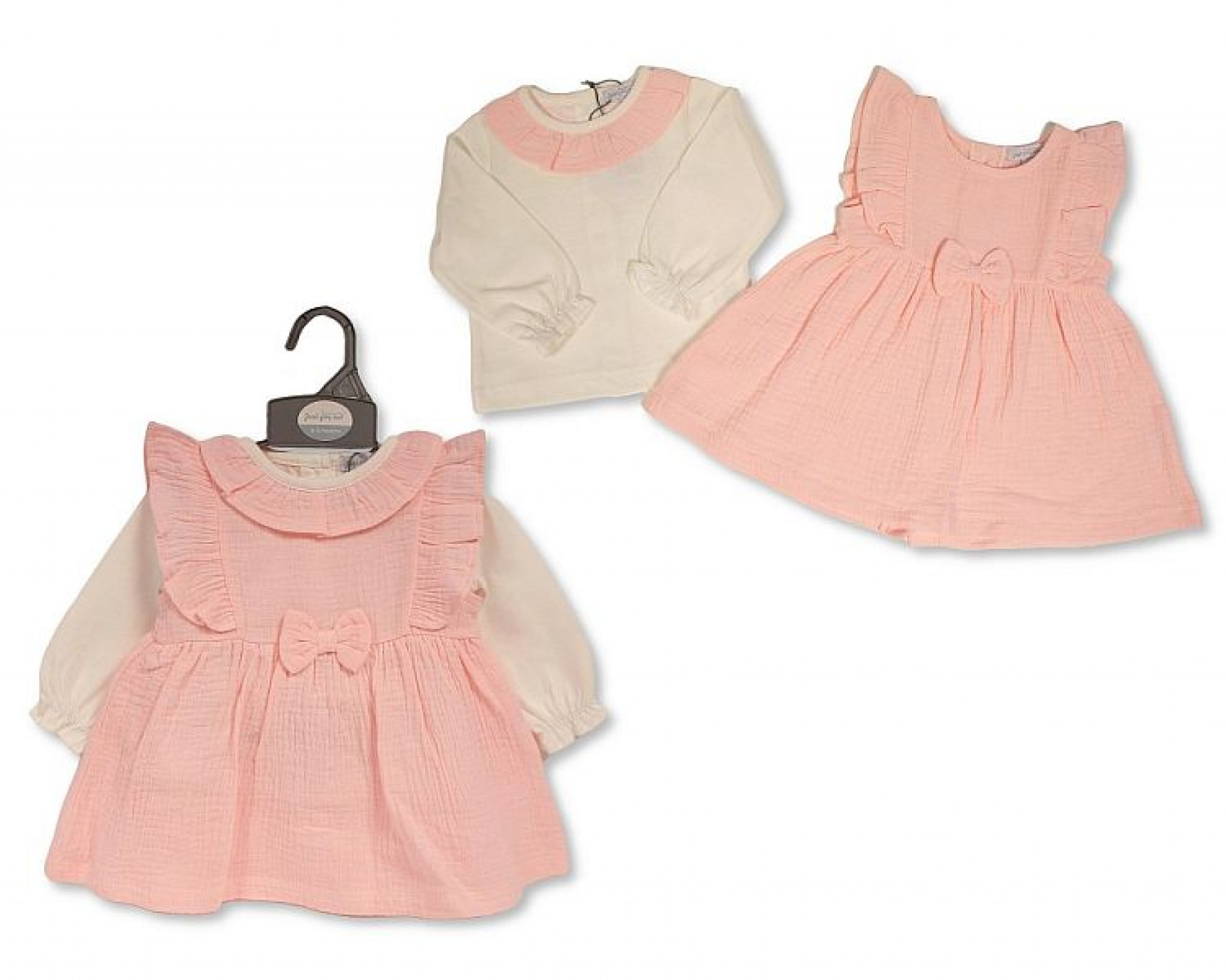 Muslin crinkle pinafore with bow and button fastening at the back.