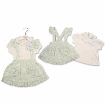 Jacquard pinafore skirt with frilled shoulder and pocket detail, finished with bows.