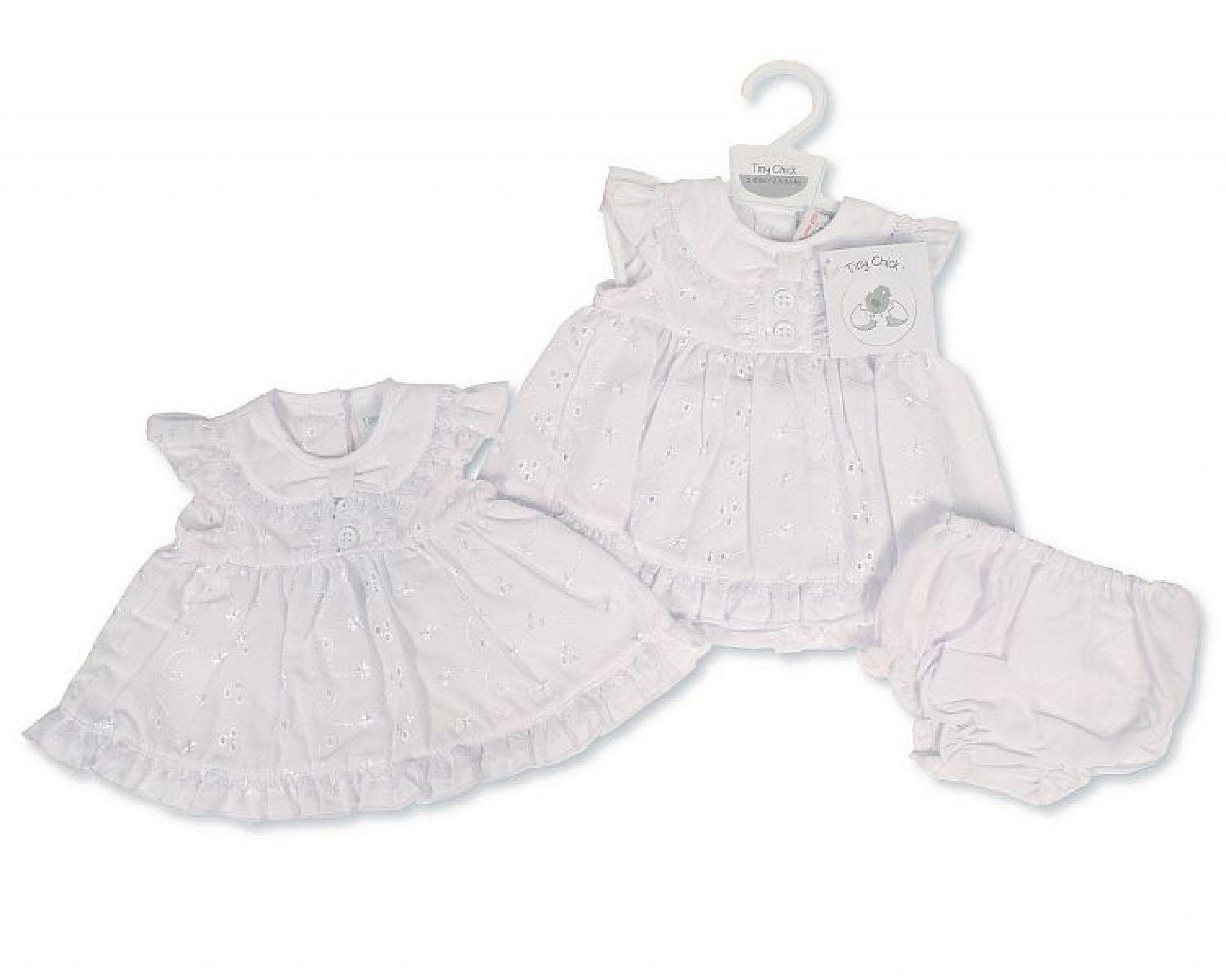 Broderie anglaise dress with back button fastening. Finished with buttons and further lace trim.