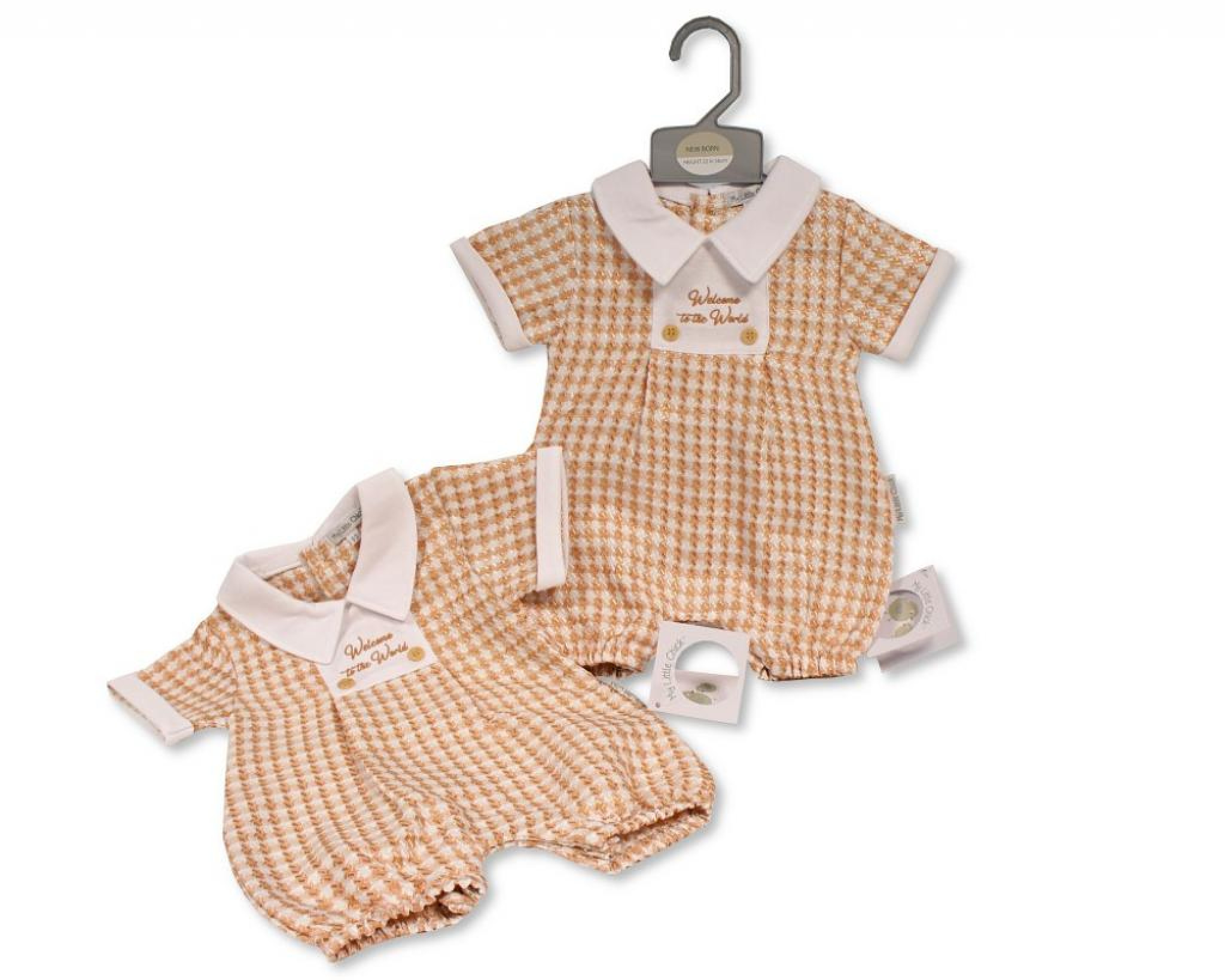 Short sleeved romper with fastening to the back and legs. Contrasting collar, cuffs. "Welcome" embroidered design and button details.
