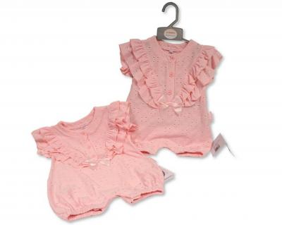 Broderie anglaise romper with button fastening to the front and poppers to the legs. Frills and ribbon bow.