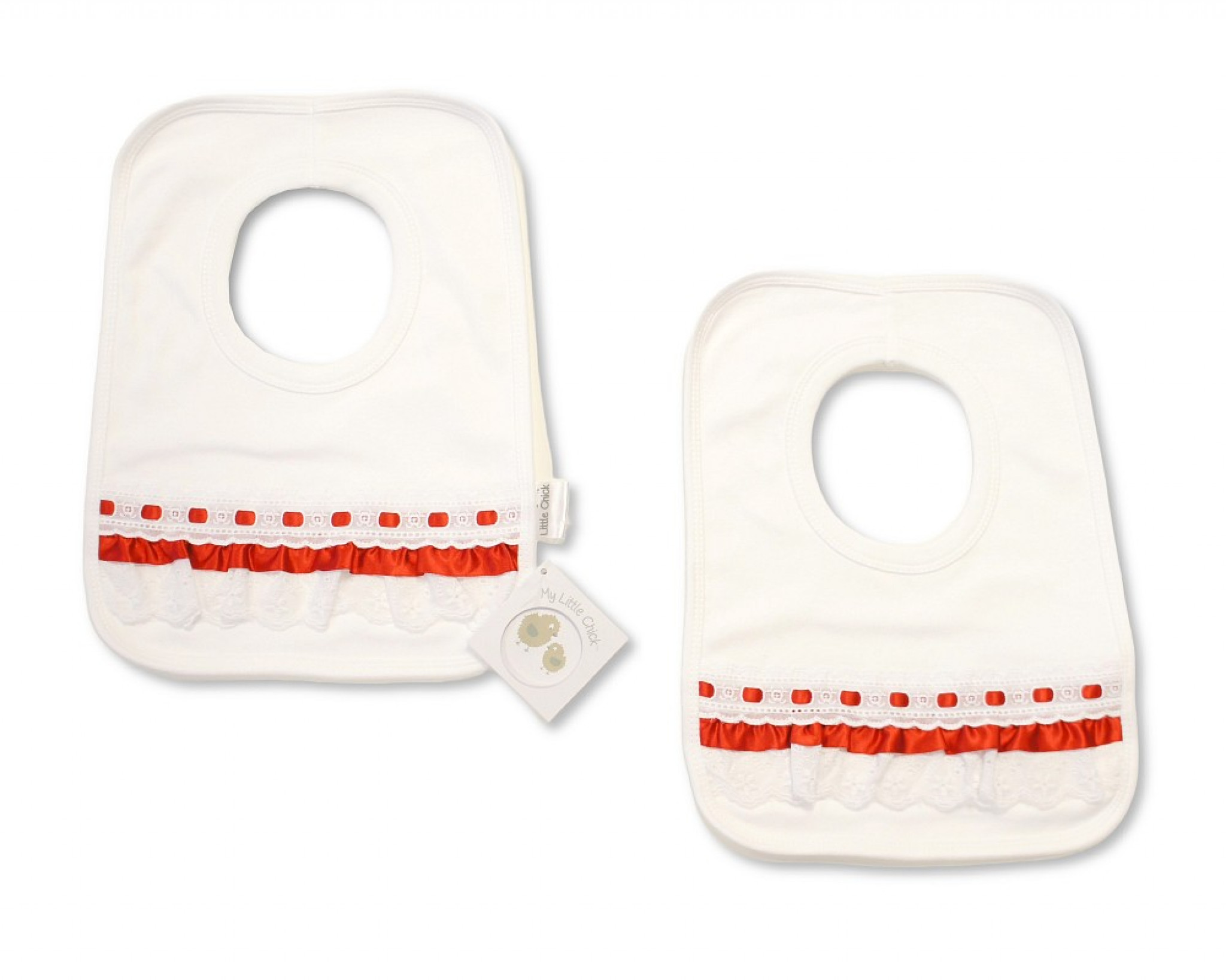 Bib with lace and ribbon trim.