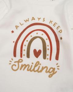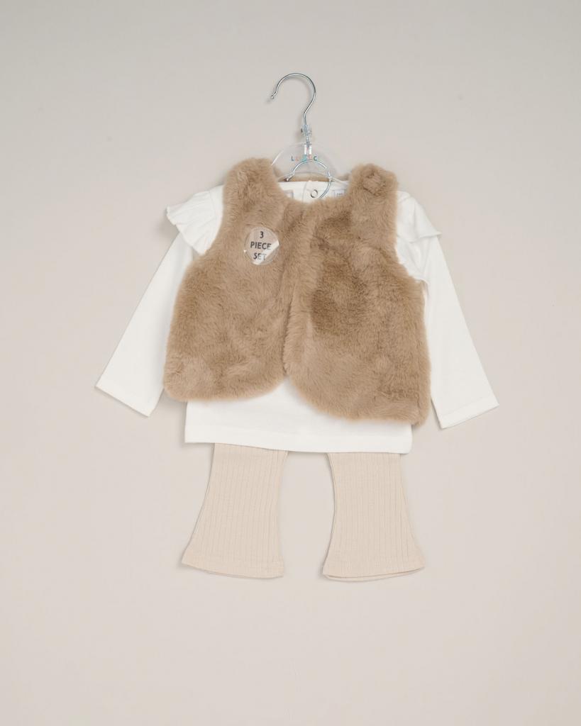 | Fibre | Cotton knit top and trousers, polyester gilet |