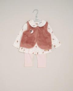 | Fibre | Cotton knit top and trousers, polyester gilet |